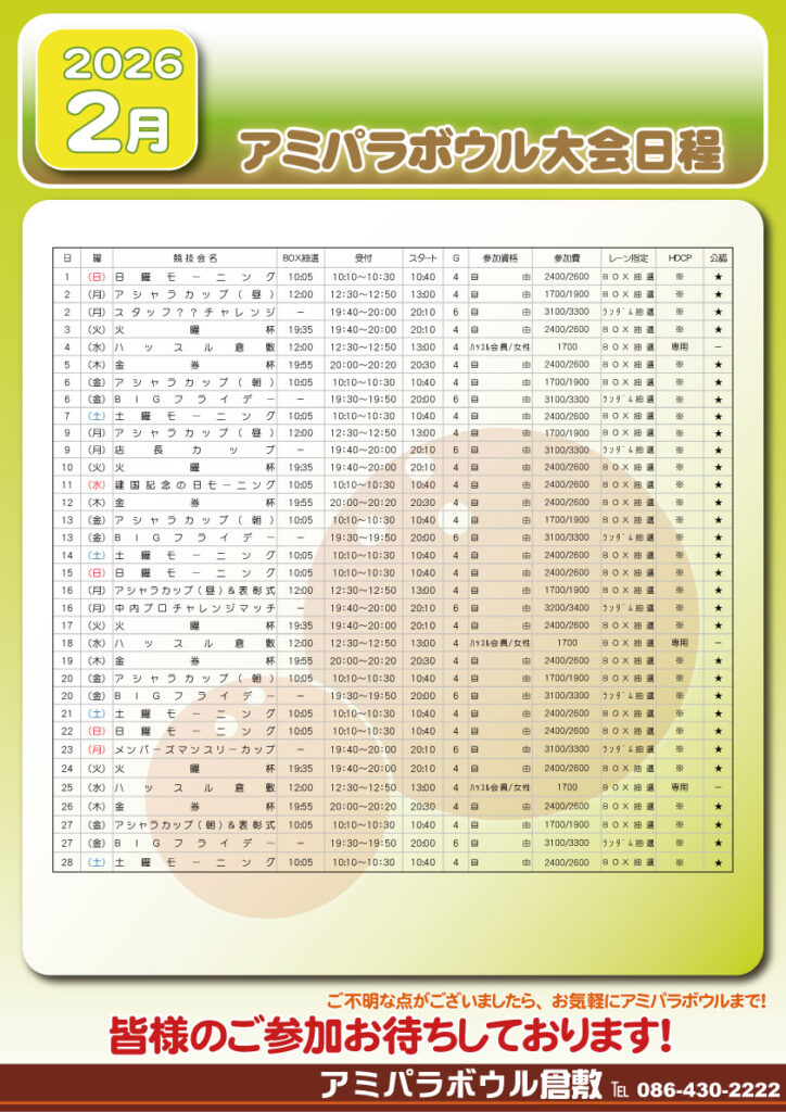 【アミパラボウル】2026年2月分の大会日程を更新いたしました